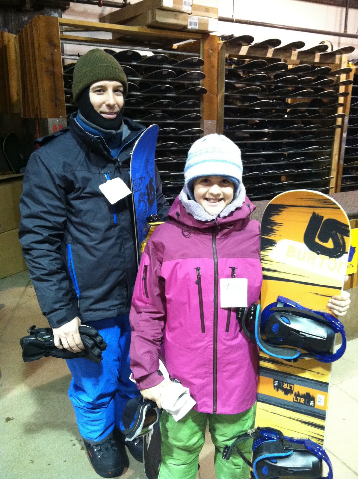 Morrie and Maria prepared for their first snowboarding lesson.